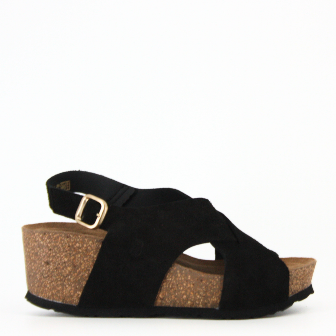 Suede crossover wedge with adjustable strap. The wedge gives extra height and elegance whilst being stylish and comfortable.