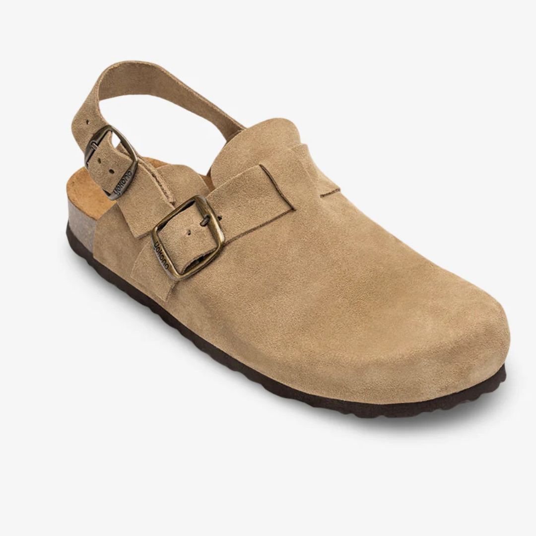 The clog 600 in beige suede, designed to offer an unparalleled experience of comfort and style. Crafted from high-quality materials, this model features a practical buckle on a strap that secures the ankle, providing fit and safety with every step. Its cushioned insole gently conforms to the foot, designed to accompany you with elegance and comfort all day long.